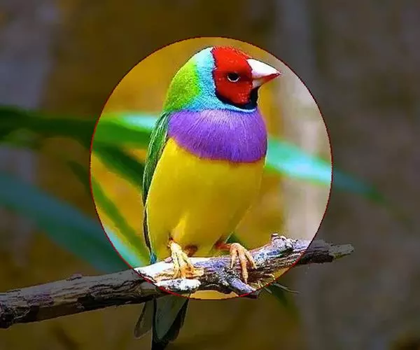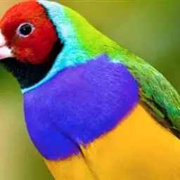 七彩文鸟的胸部的颜色也有3种,紫色、淡紫色和白色。紫色胸的七彩文鸟最为常见。雄鸟胸部紫色十分艳丽,雌鸟的紫色相对浅一些。而白胸则显得十分干净高雅。淡紫色胸的七彩文鸟相对稀少,而且很多初学者很容易将紫色胸雌鸟错认为是淡紫色胸七彩文鸟。有一个比较简单的分辨方法,淡紫色胸的雄鸟的胸和腹部的分界线十分清晰,而雌鸟胸部和腹部的分界线不清晰,有类似过渡色的感觉。无论什么样的背色和胸色,雌雄七彩文鸟的腹部都是黄色的。在绿背七彩文鸟的头和背部之间,雌雄鸟都有一个如松石蓝绚烂的蓝色脖环。而在蓝色脖环和头色之间还有一圈同时与下巴相连接的黑色细环。嘴尖的颜色通常为红色(双黄头基因的黑头七彩的嘴尖颜色为黄色),而在雌鸟进入发情期后,其嘴尖颜色会明显发黑发暗。整体而言,雄性七彩文鸟的颜色更鲜艳夺目,而雌性则颜色暗淡一些。雄鸟的尾羽有一根长长的燕尾。一般我们管绿背紫胸的七彩文鸟称之为“普彩”,绿背白胸的七彩文鸟称之为“高彩”。