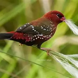 红梅花雀小型鸟类,体长9-10厘米。雄鸟通体朱红色,背、肩、胸等满布白色小斑点,…