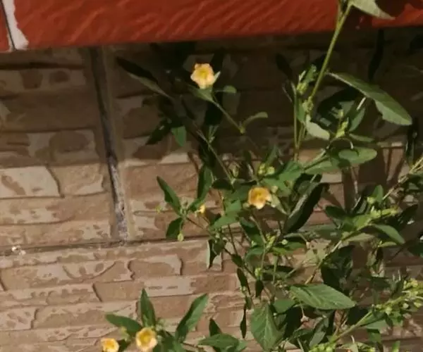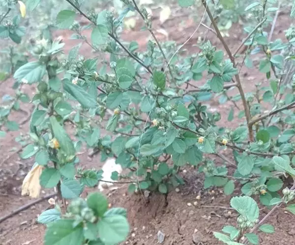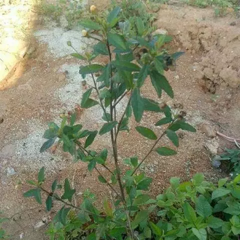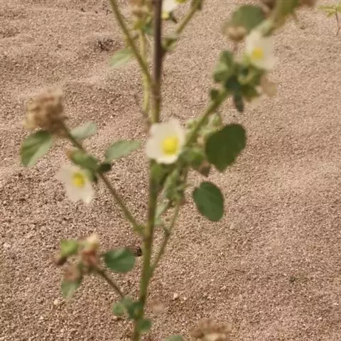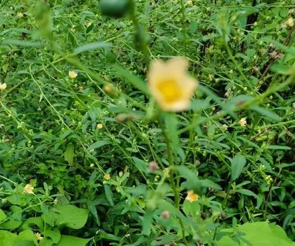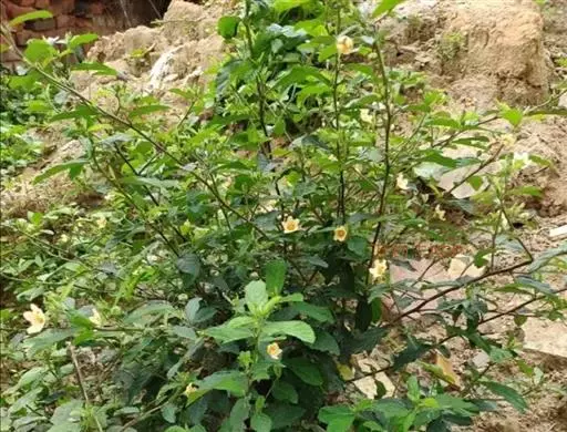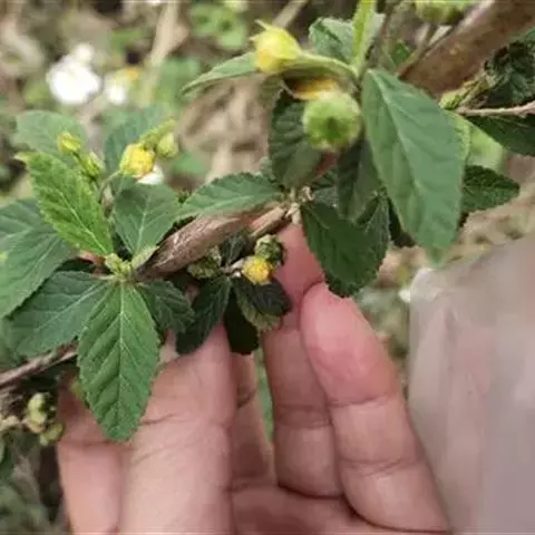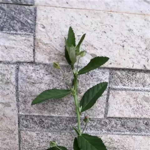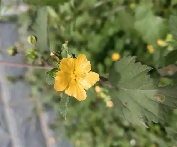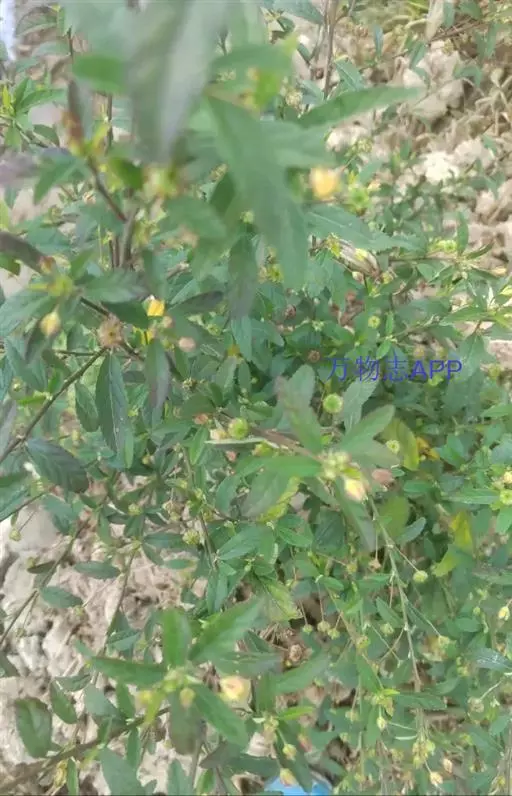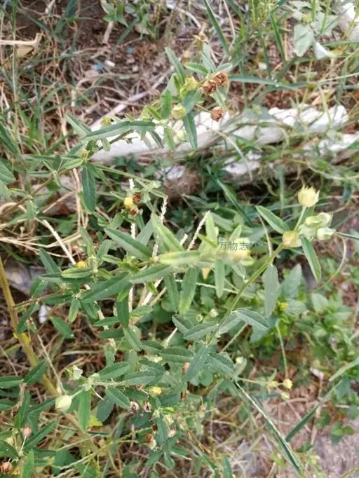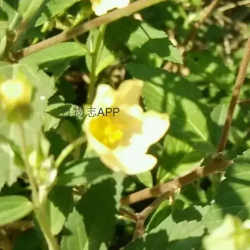 黄花稔,直立亚灌木状草本,高1-2m。分枝多小枝被柔毛至近无毛。叶互生;叶柄长4-6mm,疏被柔毛;托叶线形,与叶柄近等长,常宿存;叶披针形,长2-5cm,宽4-10mm,先端短尖或渐尖,基部圆或钝,具锯齿,两面均无毛或疏被星状柔毛,上面偶被单毛。花单朵或成对生于叶腋,花梗长4-12mm,被柔毛,中部具节;萼浅杯状,无毛,长约6mm,下半部合生,裂片5,尾状渐尖;花黄色,直径8-10mm,花瓣倒卵形,先端圆,基部狭,长6-7mm,被纤毛;雄蕊柱长约4mm,疏被硬毛。蒴果近圆球形,分果爿4-9,但常为5-6,长约3.5mm,先端具2短芒,果皮具网状皱纹。花期冬、春季。
