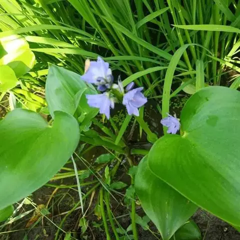 凤眼蓝(学名:Eichhornia crassipes (Mart.) Solms)浮水草本。须根发达,棕黑色。茎极短,匍匐枝淡绿色。叶在基部丛生,莲座状排列;叶片圆形,表面深绿色;叶柄长短不等,内有许多多边形柱状细胞组成的气室,维管束散布其间,黄绿色至绿色;叶柄基部有鞘状黄绿色苞片;花葶多棱;穗状花序通常具9-12朵花;花瓣紫蓝色,花冠略两侧对称,四周淡紫红色,中间蓝色,在蓝色的中央有1黄色圆斑,花被片基部合生成筒;雄蕊贴生于花被筒上;花丝上有腺毛;花药蓝灰色;花粉粒黄色;子房长梨形;花柱长约2厘米;柱头上密生腺毛。蒴果卵形。花期7-10月,果期8-11月。