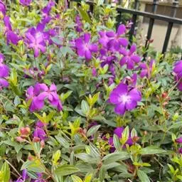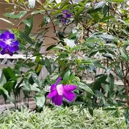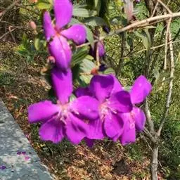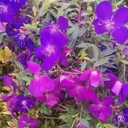 银毛野牡丹(Tibouchina aspera var.asperrima Cogn),野牡丹科蒂牡花属常绿小灌木。花枝长,花多而密,花色独特艳丽,叶质感较好,引人注目。耐修剪,花后修剪可促进枝条萌发,同时可调整株形,扦插繁殖,适应性和抗逆性强,是优良的园林观赏植物。