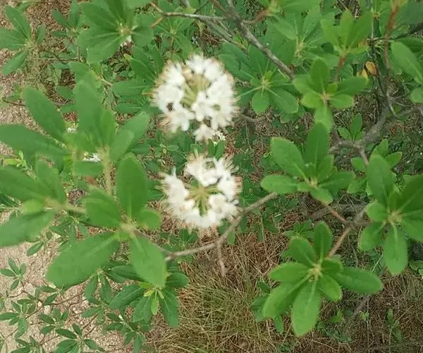 性状鉴别: 叶片多反卷,有的破碎,完整者展平后是长椭圆形或倒披针形,长2~5cm,宽0.5~1.5cm,先端钝尖,基部楔形,全缘,上面灰绿色或棕褐色,有灰白色毛茸,下面淡黄绿色,有密集的棕红色小点。主脉于下面突起,侧脉4~7对。叶柄长约3mm。近革质,易碎。枝圆柱形,顶端有圆锥花序,有多数小花,花冠钟形,白色,外被淡棕色卵状苞片。气芳香,味苦。以叶片完整、色暗绿者为佳。