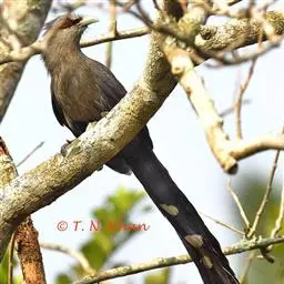 绿嘴地鹃:体形似小鸦鹃,但羽色大致绿灰;嘴绿色,头侧眼的周围有一裸区;后爪弯曲。虹膜赤红色,…