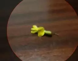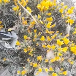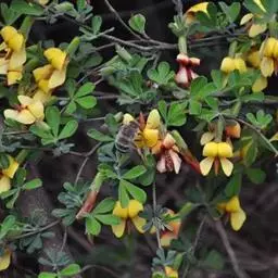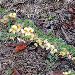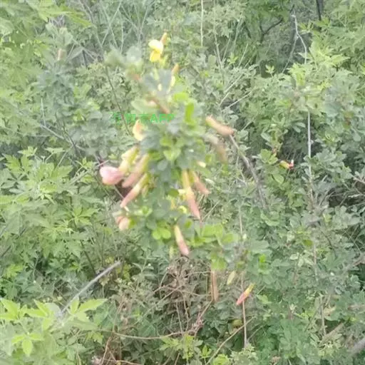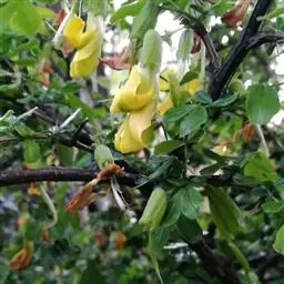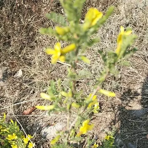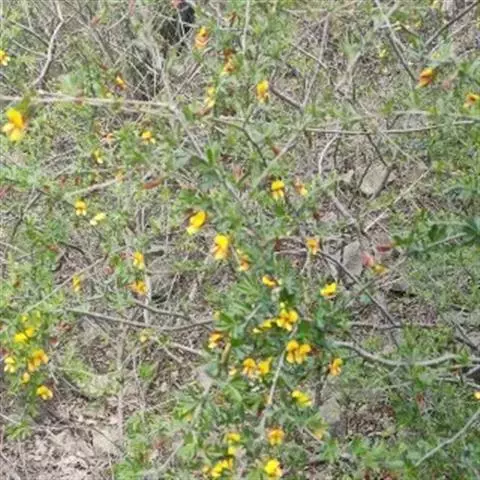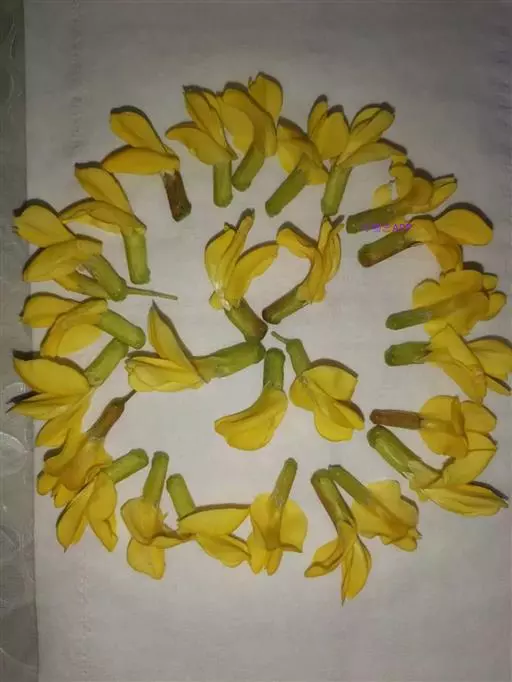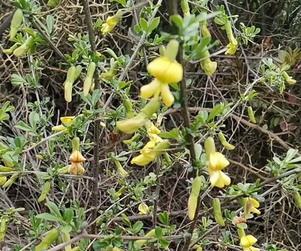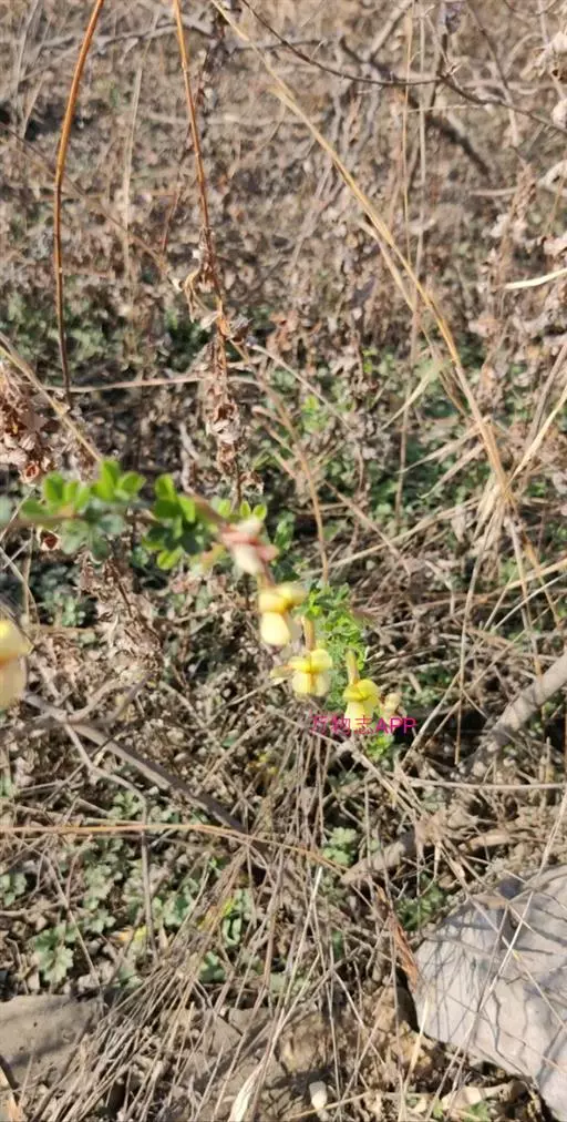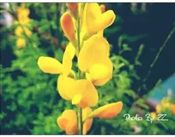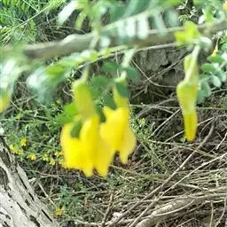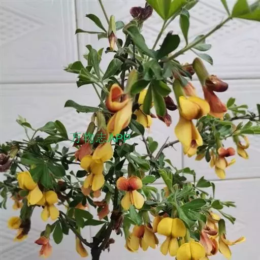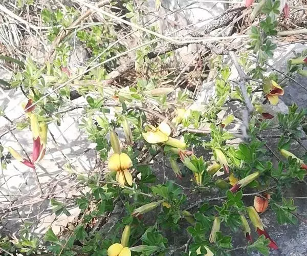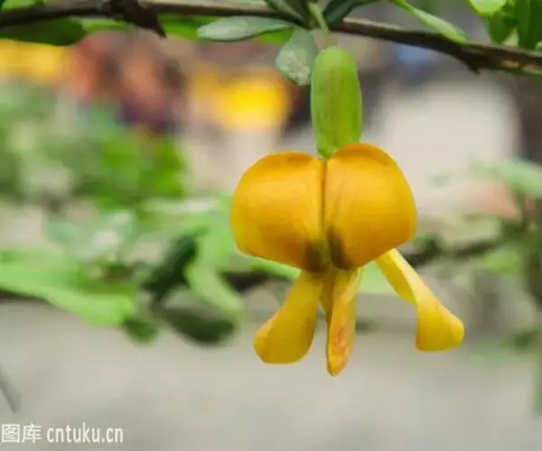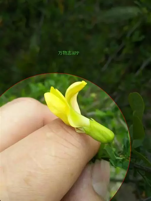 花单生,花梗长约1厘米,中部有关节;花萼钟状,长12-14毫米,宽6-9毫米,基部偏斜;花冠黄色,常带红色,长2.8-3厘米,旗瓣狭倒卵形,具短瓣柄,翼瓣稍长于旗瓣,瓣柄与瓣片近等长,耳短小,龙骨瓣宽钝;子房无毛。荚果圆筒状,长3-3.5厘米,宽约5毫米。花期4-5月,果期7月。