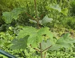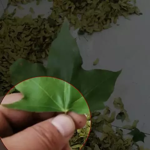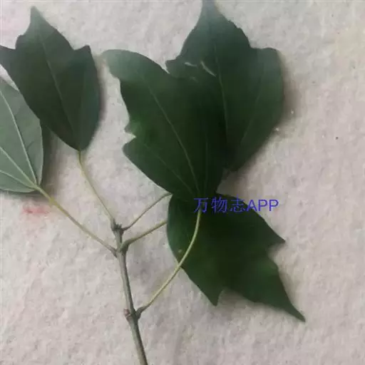 叶纸质,基部近于圆形或楔形,外貌椭圆形或倒卵形,长6-10厘米,通常浅3裂,裂片向前延伸,稀全缘,中央裂片三角卵形,急尖、锐尖或短渐尖;侧裂片短钝尖或甚小,以至于不发育,裂片边缘通常全缘,稀具少数锯齿;裂片间的凹缺钝尖;上面深绿色,下面黄绿色或淡绿色,被白粉,略被毛,在叶脉上较密;初生脉3条,稀基部叶脉也发育良好,致成5条,在上面不显著,在下面显著;侧脉通常在两面都不显著;叶柄长2.5-5厘米,淡紫绿色,细瘦,无毛。