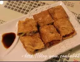 【主要材料】春卷皮12张,五香豆干200克、猪肉150克、卷心菜100克、胡萝卜80克、淀粉适量、调料、食用油500克、酱油1/2大匙、精盐2小 春卷 匙。