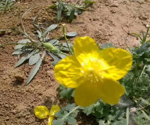 伞形花序多花;花梗纤细,长2-8厘米,幼时被长柔毛,后变无毛;苞片小,卵形,长1-2毫米。花芽卵圆形,直径5-8毫米;萼片卵圆形,舟状,长5-8毫米,无毛或疏生柔毛,早落;花瓣倒卵形,长约1厘米,全缘,黄色;雄蕊长约8毫米,花丝丝状,黄色,花药长圆形,长约1毫米;子房线形,长约8毫米,绿色,无毛,花柱长约1毫米,柱头2裂。