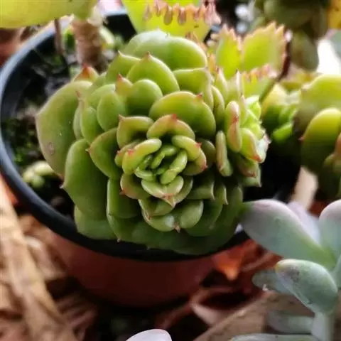 观音莲,隶属景天科,长生草属。因其形似绿色莲花的端庄造型和较易成活、繁殖的特性受到许多花卉爱好者的青睐。株型较大且向外张开,稍扁平,通常直径5-7厘米。匍匐茎短且壮,可达4厘米。幼株叶子较少。