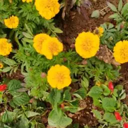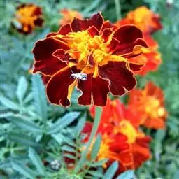 万寿菊是菊科万寿菊属一年生草本植物,别名孔雀菊、缎子花、臭菊花、西番菊、红黄草、小万寿菊、臭芙蓉、孔雀草。万寿菊茎近基部分枝。叶羽状分裂,长5-10厘米,宽4-8厘米,裂片长椭圆形或披针形,具锐齿,上部叶裂片齿端有长细芒,叶缘有少数腺体。头状花序单生,径5-8厘米,花序梗顶端棍棒状。总苞长1.8-2厘米,径1-1.5厘米,杯状,顶端具尖齿。舌状花黄或暗橙黄色,长2.9厘米,舌片倒卵形,长1.4厘米,基部成长爪,先端微弯缺。管状花花冠黄色,长约9毫米,冠檐5齿裂。瘦果线形,被微毛;冠毛有1-2长芒和2-3短而钝鳞片。花期7-9月。万寿菊中国各地均有栽培,在广东和云南南部、东南部已归化,国外原产墨西哥。万寿菊对土壤要求不严,但以肥沃疏松排水良好的土壤为好。耐移栽,种子发芽适温21-24℃,植株生长适合温度为20-29℃。喜温暖和阳光充足的环境,不