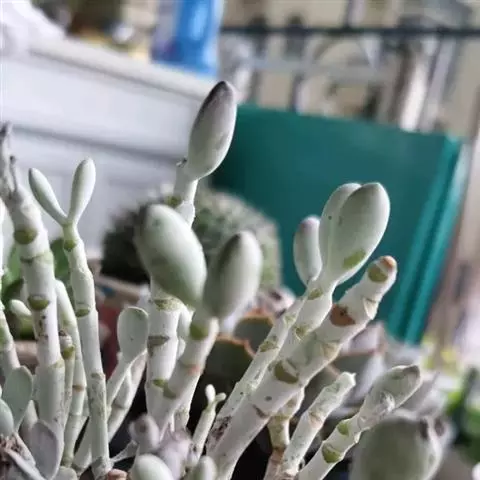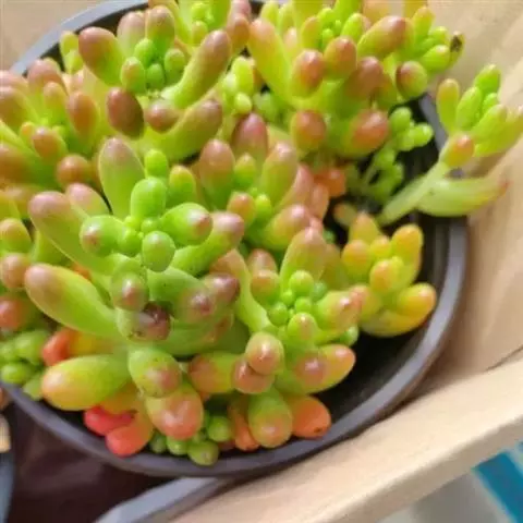 灯美人是景天科的园艺品种,多肉植物。叶片近柱状,丛生,在日照时间长、温差大的环境下会呈现橙粉色。