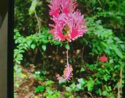 花单生于枝端叶腋间,花梗细瘦,下垂,长8-14厘米,平滑无毛或具纤毛,中部具节;小苞片5,极小,披针形,长1-2毫米,被纤毛;花萼管状,长约1.5厘米,疏被细毛,具5浅齿裂,常一边开裂;花瓣5,红色,长约5厘米,深细裂作流苏状,向上反曲;雄蕊柱长而突出,下垂,长9-10厘米,无毛;花柱枝5,无毛。