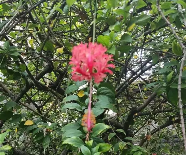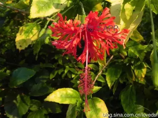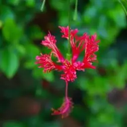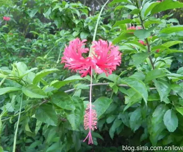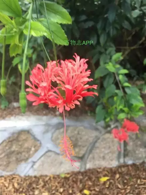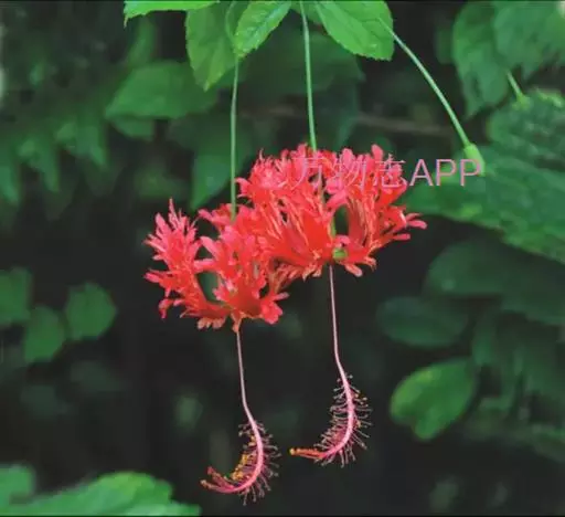 吊灯扶桑(学名:Hibiscus schizopetalus (Masters) Hook.f.):常绿直立灌木,高达3米;小枝细瘦,常下垂,平滑无毛。叶椭圆形或长圆形,边缘具齿缺,两面均无毛;托叶钻形,长约2毫米,常早落。花单生于枝端叶腋间;小苞片5,极小,披针形。花瓣5,红色,长约5厘米,深细裂作流苏状,向上反曲;雄蕊柱长而突出,下垂,长9-10厘米,无毛。蒴果长圆柱形,长约4厘米,直径约1厘米。花期全年。