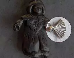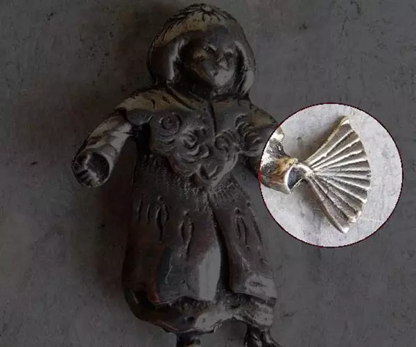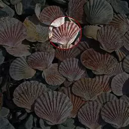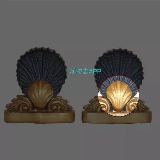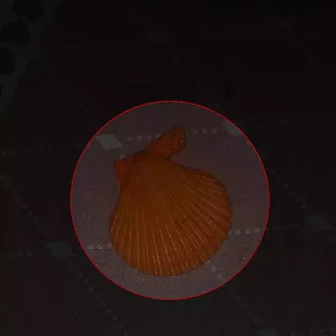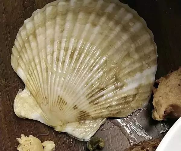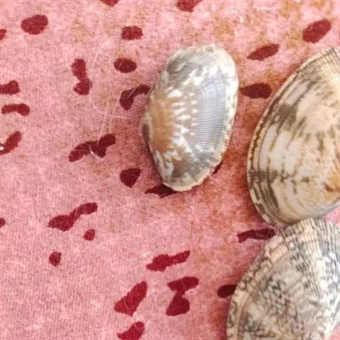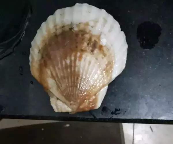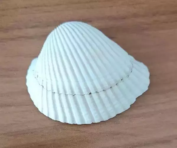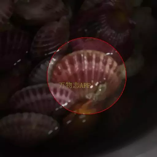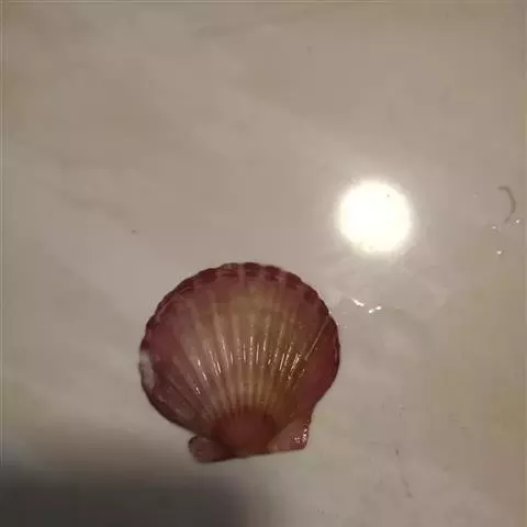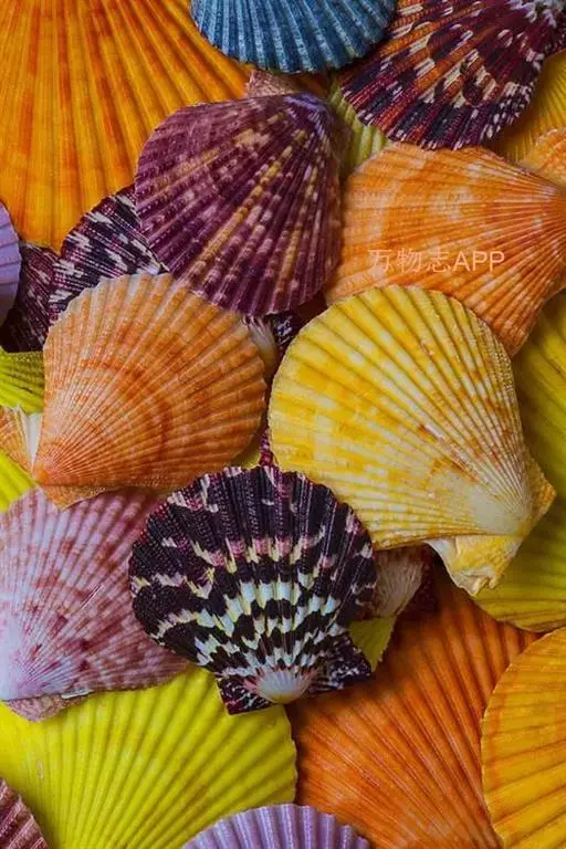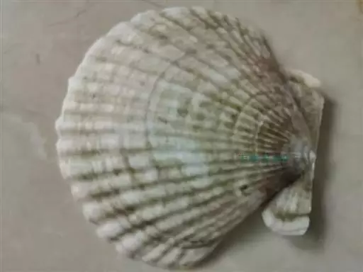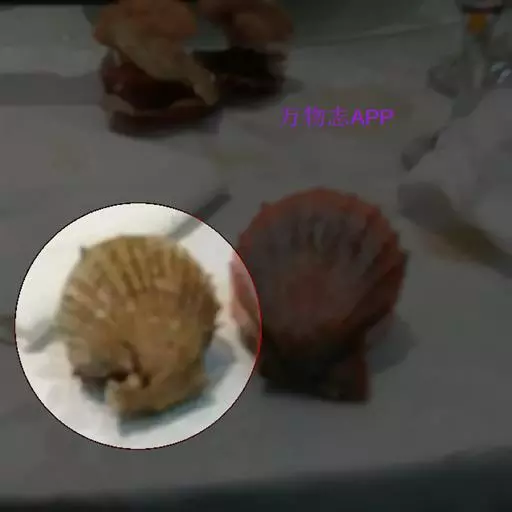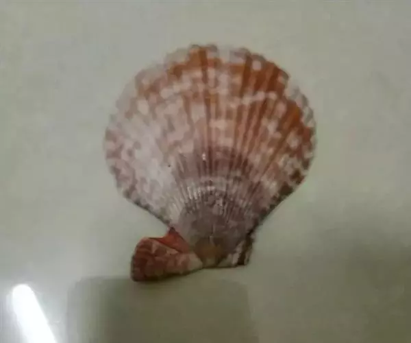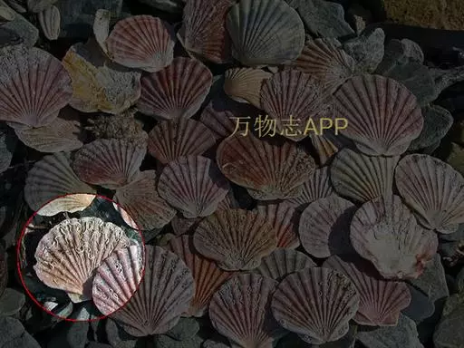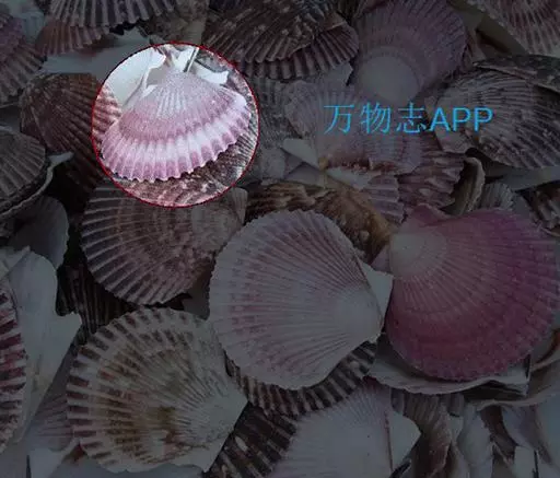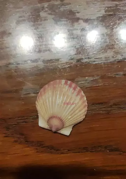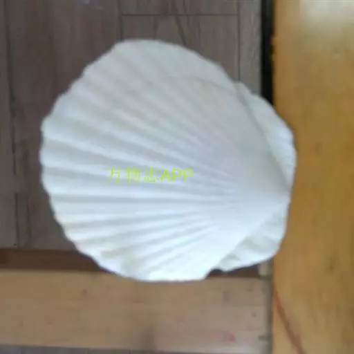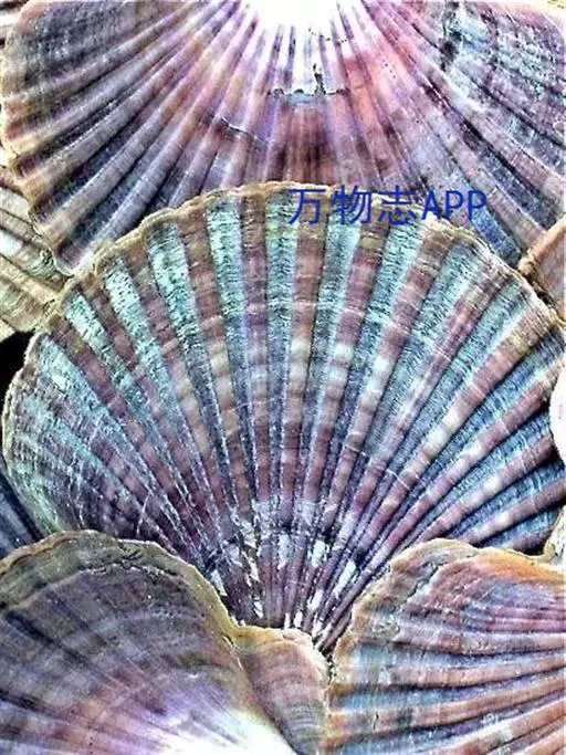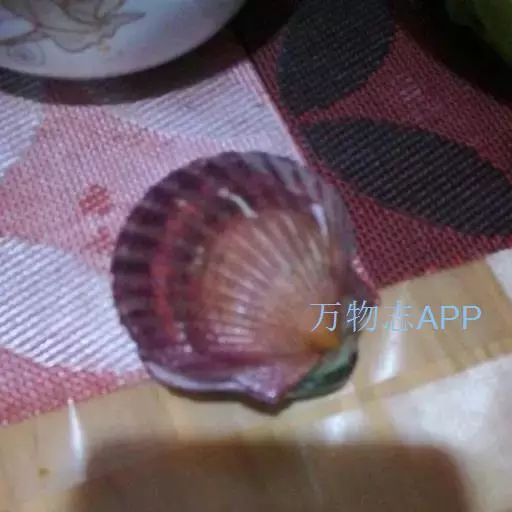 贝壳中等大小,壳质较薄,但很坚韧,呈圆形。壳较凸,两壳及壳两侧均略等,壳背缘较直,腹缘及前、后缘均呈圆形。两壳关闭时两侧略留有狭孔。壳顶尖、低,不突出壳背缘。壳顶前方和后方有壳耳左壳两耳略等右壳前耳略较后耳小,呈长方形其他皆呈三角形足丝孔位于右壳前耳下方,较小,呈三角形,具数枚细栉柿齿。壳表多呈灰褐色或浅黄褐色,具深褐色或紫褐色云状花斑,一般左壳的颜色较浅而右壳较深。两壳面皆布满放射肋肋呈圆形,较光滑,约有18条左右,肋上的生长小棘较低平左壳肋较窄,肋间距离较宽右壳相反,肋较宽而肋间距离较窄。贝壳内面色浅,略近白色,稍具光泽闭壳肌痕略显,近圆形有与壳面相应的肋与沟。铰合部较细长,韧带深褐色,位于三角形的韧带槽中,中央关节较明显。