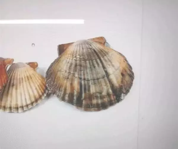 海湾扇贝(学名:Argopecten irradians)是扇贝科、海湾扇贝属贝类。贝壳中等大小,壳质较薄,但很坚韧,呈圆形。壳较凸,两壳及壳两侧均略等,壳背缘较直,腹缘及前、后缘均呈圆形。两壳关闭时两侧略留有狭孔。壳顶尖、低,不突出壳背缘。壳顶前方和后方有壳耳左壳两耳略等右壳前耳略较后耳小。壳表多呈灰褐色或浅黄褐色,具深褐色或紫褐色云状花斑,一般左壳的颜色较浅而右壳较深。两壳面皆布满放射肋肋呈圆形,较光滑,约有18条左右,肋上的生长小棘较低平左壳肋较窄,肋间距离较宽右壳相反,肋较宽而肋间距离较窄。贝壳内面色浅,略近白色,稍具光泽闭壳肌痕略显,近圆形有与壳面相应的肋与沟。铰合部较细长,韧带深褐色,位于三角形的韧带槽中,中央关节较明显。