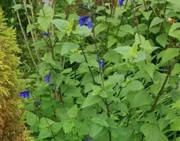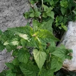 茎叶卵状长圆形或卵圆形,大小不等,长1.5-6厘米,宽0.7-2.5厘米,先端钝,基部圆形、截形至宽楔形,下延至叶柄成狭翅,边缘具不明显的波状齿或几近全缘,草质,上面橄榄绿色,具短硬毛或几无毛,下面淡绿色,几无毛,侧脉3-4对,在下面略突出,叶柄长0.7-2.5厘米,自下部向上渐变短。