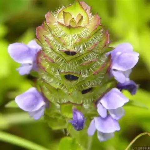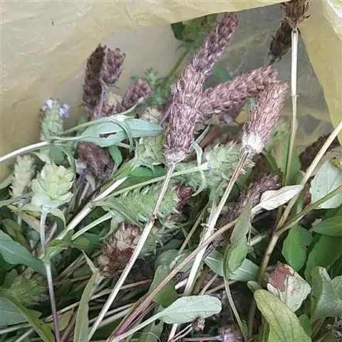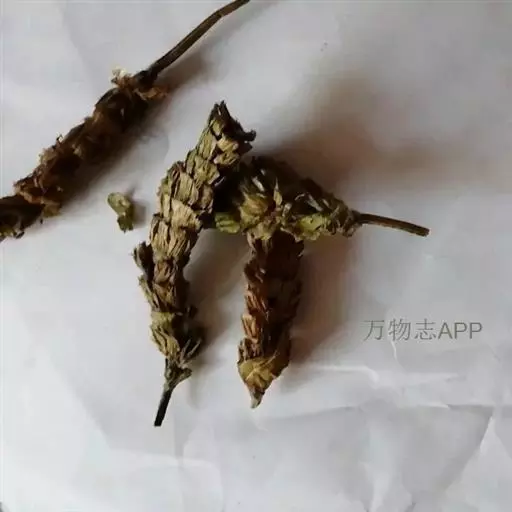 干燥果穗呈长圆柱形或宝塔形,长2.5~6.5cm,直径 1~1.5cm,棕色或淡紫褐色。宿萼数轮至十数轮,作覆瓦状排列,每轮有5-6个具短柄的宿萼,下方对生苞片2枚。苞片肾形,淡黄褐色,纵脉明显,基部楔形,先端尖尾状,背面生白色粗毛。宿萼唇形,上唇宽广,先端微3裂,下唇2裂,裂片尖三角形,外面有粗毛。花冠及雄蕊都已脱落。宿萼内有小坚果4枚,棕色,有光泽。体轻质脆,微有清香气,味淡。以色紫褐、穗大者为佳。 长冠夏枯草 本品与夏枯草相亿,但花冠较长,18~221mm。