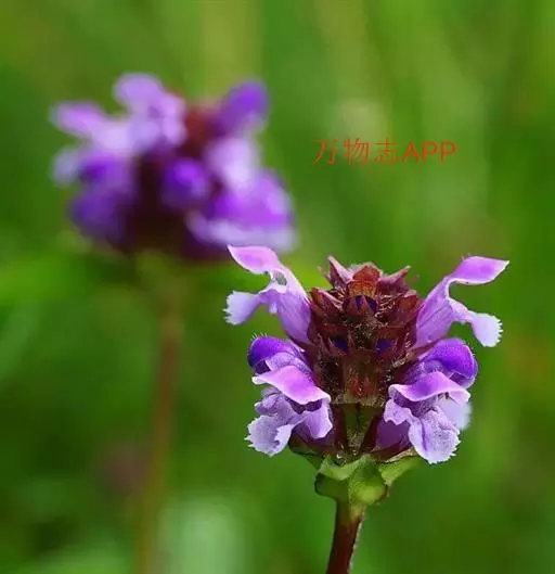 花萼钟形,连齿长约10毫米,筒长4毫米,倒圆锥形,外面疏生刚毛,二唇形,上唇扁平,宽大,近扁圆形,先端几截平,具3个不很明显的短齿,中齿宽大,齿尖均呈刺状微尖,下唇较狭,2深裂,裂片达唇片之半或以下,边缘具缘毛,先端渐尖,尖头微刺状。花冠紫、蓝紫或红紫色,长约13毫米,略超出 夏枯草全株 于萼,冠筒长7毫米,基部宽约1.5毫米,其上向前方膨大,至喉部宽约4毫米,外面无毛,内面约近基部1/3处具鳞毛毛环,冠檐二唇形,上唇近圆形,径约5.5毫米,内凹,多少呈盔状,先端微缺,下唇约为上唇1/2, 3裂,中裂片较大,近倒心脏形,先端边缘具流苏状小裂片,侧裂片长圆形,垂向下方,细小。雄蕊4,前对长很多,均上升至上唇片之下,彼此分离,花丝略扁平,无毛,前对花丝先端2裂,1裂片能育具花药,另1裂片钻形,长过花药,稍弯曲或近于直立,后对花丝的不育裂片微呈瘤状突出,花药2室,室极叉开。花柱纤细,先端相等2裂,裂片钻形,外弯。花盘近平顶。子房无毛。