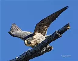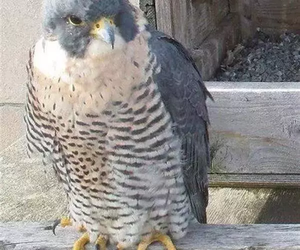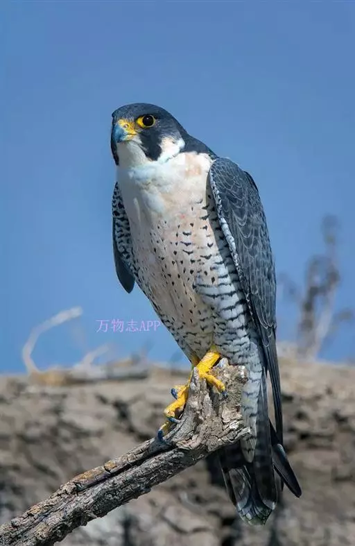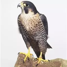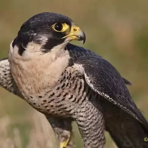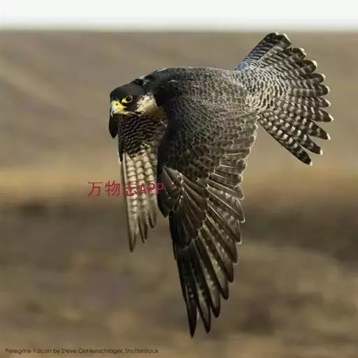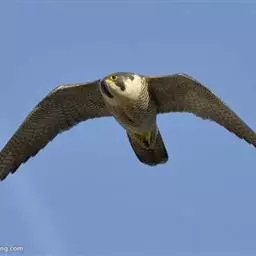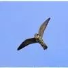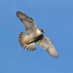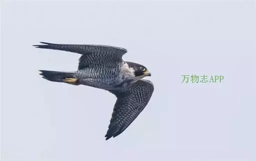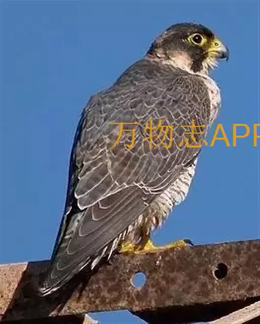 游隼(学名:Falco peregrinus):是中型猛禽,共有18个亚种。体长41-50厘米。翅长而尖,眼周黄色,颊有一粗著的垂直向下的黑色髭纹,头至后颈灰黑色,其余上体蓝灰色,尾具数条黑色横带。下体白色,上胸有黑色细斑点,下胸至尾下覆羽密被黑色横斑。飞翔时翼下和尾下白色,密布白色横带,常在鼓翼飞翔时穿插着滑翔,也常在空中翱翔,野外容易识别。幼鸟上体暗褐色,下体淡黄褐色,胸、腹具黑褐色纵纹。