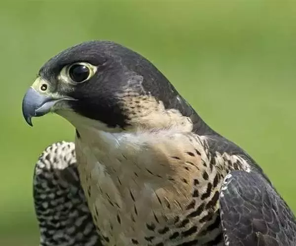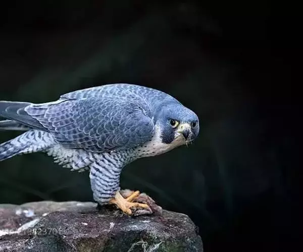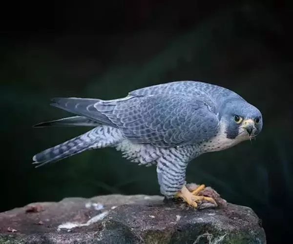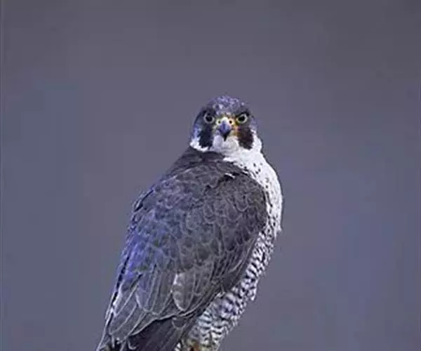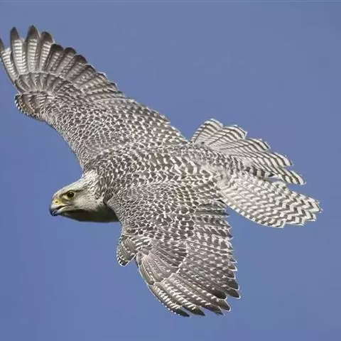 游隼是体形比较大的隼类,体长为38-50厘米,翼展95-115厘米,体重647-825克,寿命11年。中型猛禽。头顶和后颈暗石板蓝灰色到黑色,有的缀有棕色;背、肩蓝灰色,具黑褐色羽干纹和横斑,腰和尾上覆羽亦为蓝灰色,但稍浅,黑褐色横斑亦较窄;尾暗蓝灰色,具黑褐色横斑和淡色尖端;翅上覆羽淡蓝灰色,具黑褐色羽干纹和横斑;飞羽黑褐色,具污白色端斑和微缀棕色斑纹,内翈具灰白色横斑;脸颊部和宽阔而下垂的髭纹黑褐色。喉和髭纹前后白色,其余下体白色或皮黄白色,上胸和颈侧具细的黑褐色羽干纹,其余下体具黑褐色横斑,翼下覆羽,腋羽和覆腿羽亦为白色,具密集的黑褐色横斑。