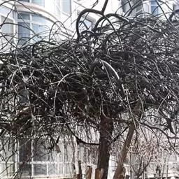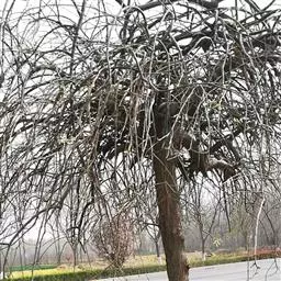 垂枝榆抗逆性强,工程养护管理比较粗放,定植后灌1~2次透水就可以保证成活。除草、适当施肥可促进砧木和接穗的生长发育,此外要及时除去砧木上的蘖生枝芽,特别是接穗旁边和下部的蘖生芽,以利于接穗叶片吸收足够的养分,促进光合作用。对株距小、空间少的植株通过绑扎,抑强促弱,纠正偏冠,使枝条均匀生长。当垂枝接近地面时,从离地面30~50厘米处剪齐,让其先形成一个金黄色圆柱体,为以后造型奠定基础。