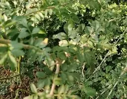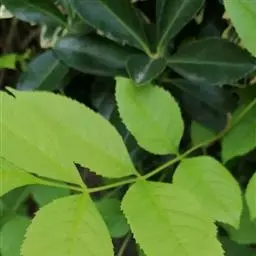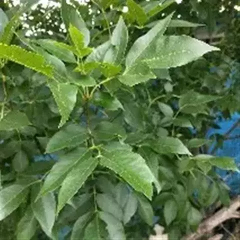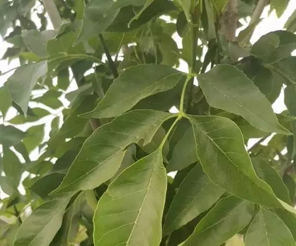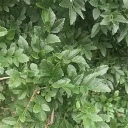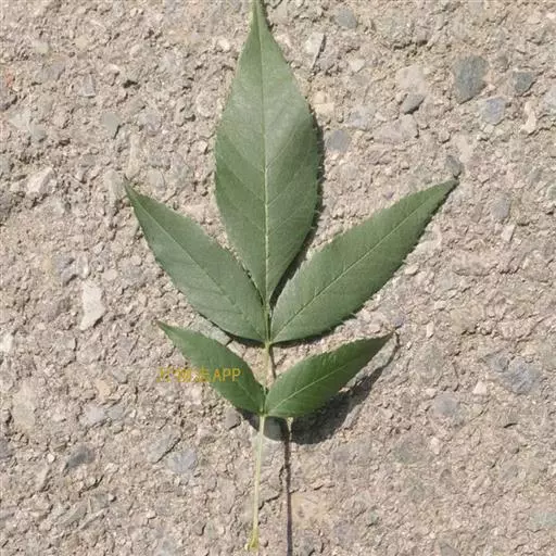 羽状复叶长15-25厘米;叶柄长4-6厘米,基部不增厚;叶轴挺直,上面具浅沟,初时疏被柔毛,旋即秃净;小叶5-7枚,硬纸质,卵形、倒卵状长圆形至披针形,长3-10厘米,宽2-4厘米,顶生小叶与侧生小叶近等大或稍大,先端锐尖至渐尖,基部钝圆或楔形,叶缘具整齐锯齿,上面无毛,下面无毛或有时沿中脉两侧被白色长柔毛,中脉在上面平坦,侧脉8-10对,下面凸起,细脉在两面凸起,明显网结;小叶柄长3-5毫米。