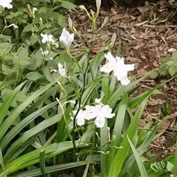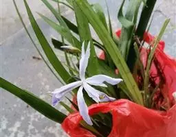 花为浅蓝色、蓝色或蓝紫色,花被上有较深色的条纹,花茎光滑,高5-10厘米;苞片3-5枚,草质,绿色,边缘白色,披针形,长4.5-10厘米,宽0.8-1.6厘米,顶端渐尖或长渐尖,内包含有2-4朵花;花乳白色,直径5-6厘米;花梗长4-7厘米;花被管甚短,长约3毫米,外花被裂片倒披针形,长4.5-6.5厘米,宽0.8-1.2厘米,顶端钝或急尖,爪部楔形,内花被裂片狭倒披针形,长4.2-4.5厘米,宽5-7毫米,爪部狭楔形;雄蕊长2.5-3.2厘米,花药黄色,花丝白色;子房纺锤形,长3-4.5厘米。