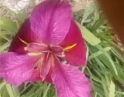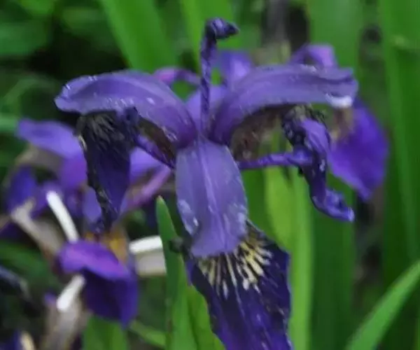 西南鸢尾(学名:Iris bulleyana Dykes):多年生草本。根状茎较粗壮,斜伸,节密集。叶基生,条形,无明显的中脉。花茎中空,光滑,生有2-3片茎生叶。苞片2-3枚,膜质,绿色,边缘略带红褐色,内包含有1-2朵花;花天蓝色,直径6.5-7.5厘米;外花被裂片倒卵形,爪部楔形,具蓝紫色的斑点及条纹,内花被裂片直立,披针形或宽披针形,淡蓝紫色,花盛开时略向外倾。蒴果三棱状柱形,6条肋明显,表面具明显的网纹;种子棕褐色,扁平,半圆形。花期6-7月,果期8-10月。