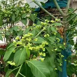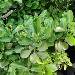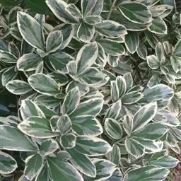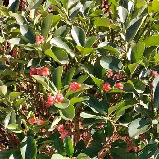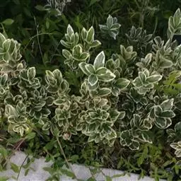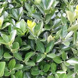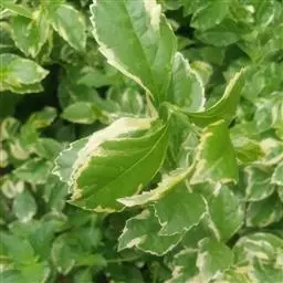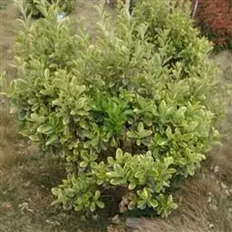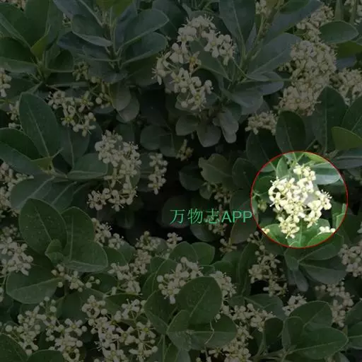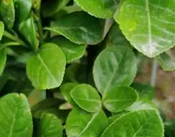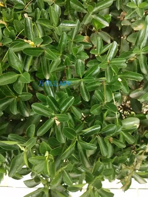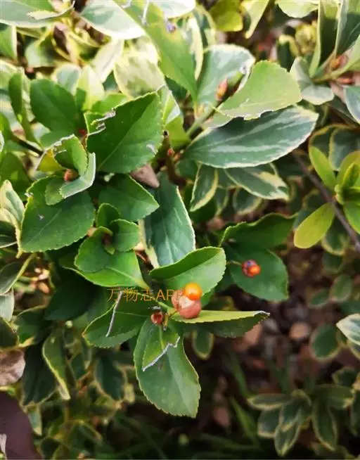 冬青卫矛(学名:Euonymus japonicus Thunb.):俗名大叶黄杨或简称“黄杨”。灌木,高可达3米;小枝四棱,具细微皱突。叶革质,有光泽,倒卵形或椭圆形,先端圆阔或急尖,基部楔形,边缘具有浅细钝齿。聚伞花序5-12花,分枝及花序梗均扁壮,花白绿色,直径5-7毫米;花瓣近卵圆形,长宽各约2毫米。蒴果近球状,淡红色;种子每室1,顶生,椭圆状,假种皮桔红色,全包种子。花期6-7月,果熟期9-10月。