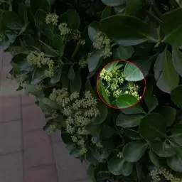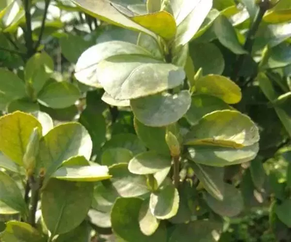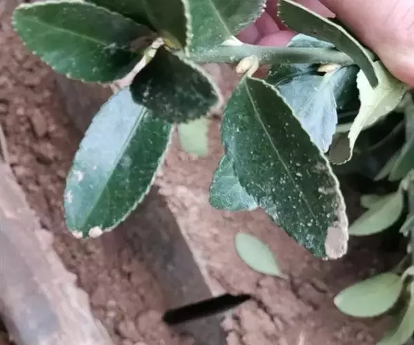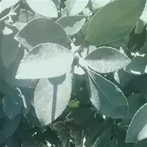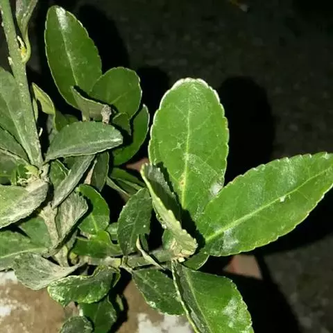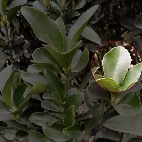 危害大叶黄杨叶片,被害植株叶片表现皱缩畸形,影响生长。白粉病多分布于大叶黄杨的叶正面,少有生长在叶背面的,单个病斑圆形,白色病斑扩大相互愈合之后不规则。
