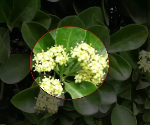 聚伞花序5-12花,花序梗长2-5厘米,2-3次分枝,分枝及花序梗均扁壮,第三次分枝常与小花梗等长或较短;小花梗长3-5毫米;花白绿色,直径5-7毫米;花瓣近卵圆形,长宽各约2毫米,雄蕊花药长圆状,内向;花丝长2-4毫米;子房每室2胚珠,着生中轴顶部。