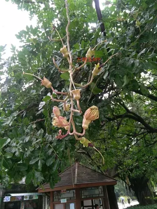吊灯树(拉丁学名:Kigelia africana (Lam.) Benth.),别名:香肠树,腊肠树(台湾木本植物志);乔木,高13-20米,枝下高约2米,胸径约1米。奇数羽状复叶交互对生或轮生,叶轴长7.5-15厘米;小叶7-9枚,长圆形或倒卵形,顶端急尖,基部楔形,全缘,叶面光滑,亮绿色,背面淡绿色,被微柔毛,近革质,羽状脉明显。喜高温、湿润、阳光充足的环境,在中国热带地区都有分布。