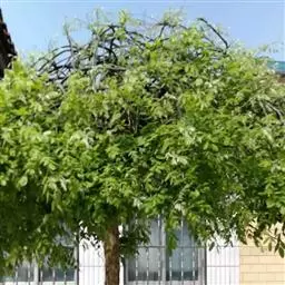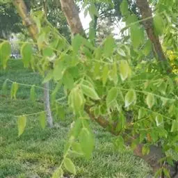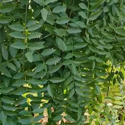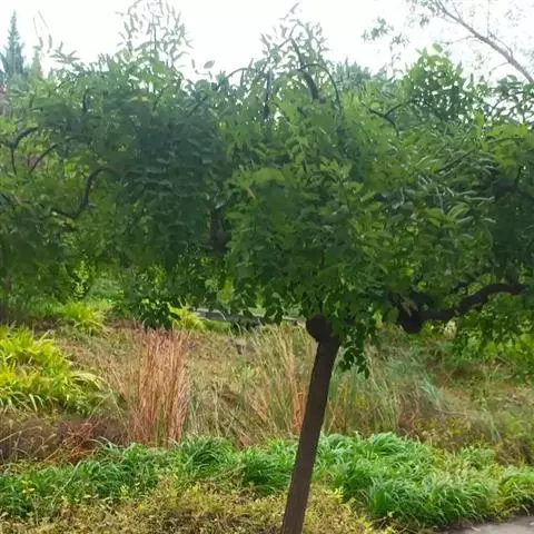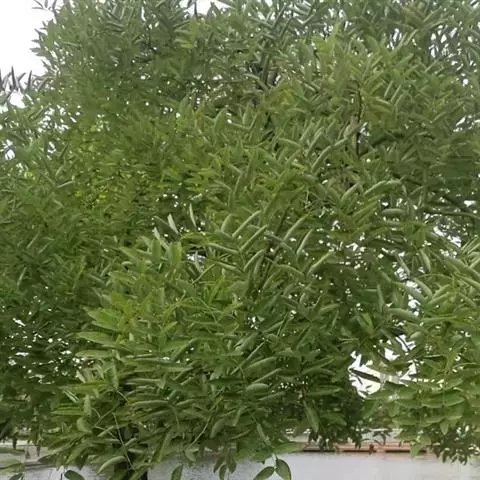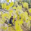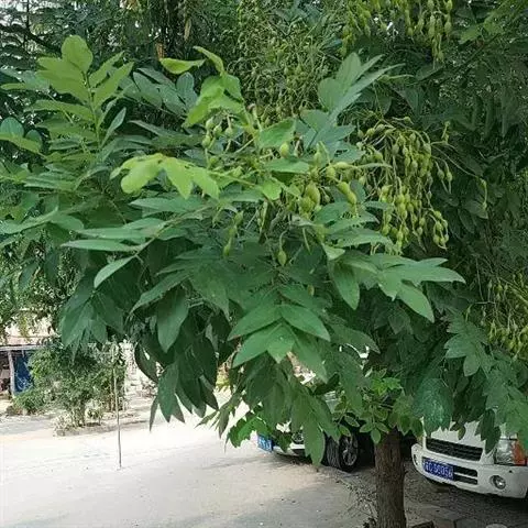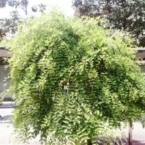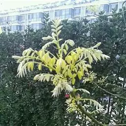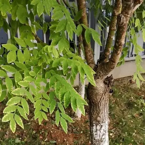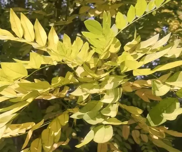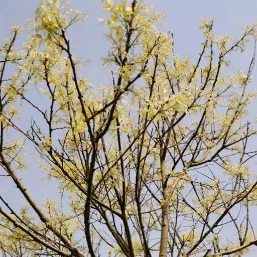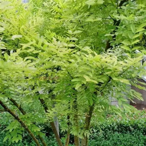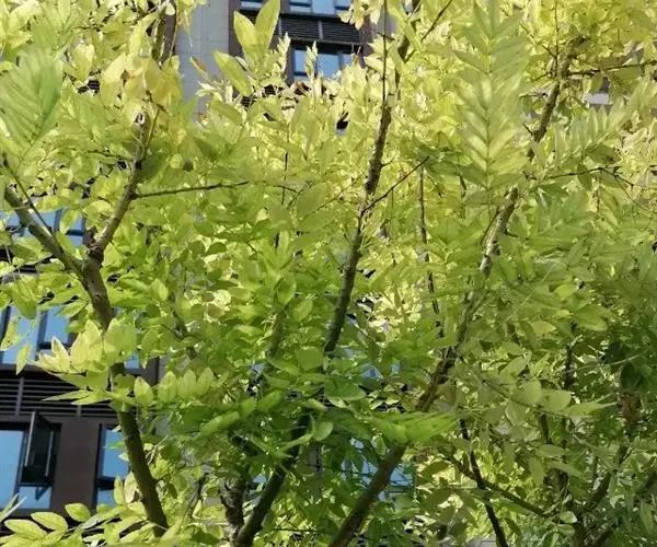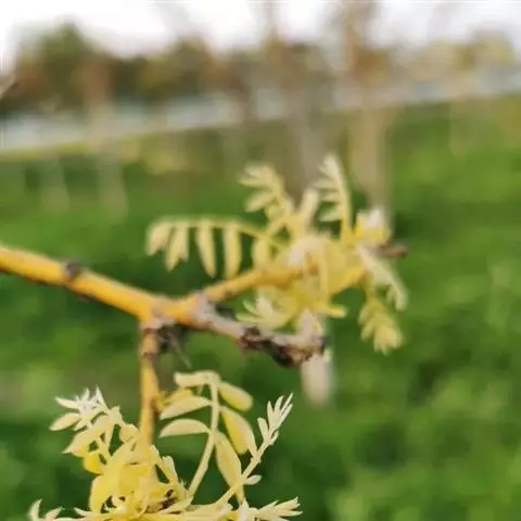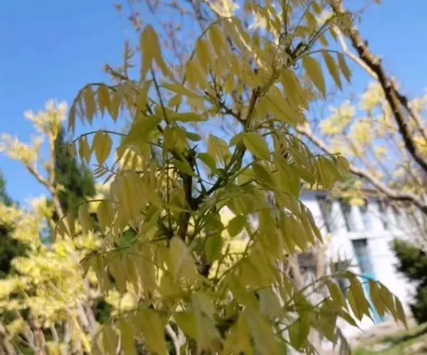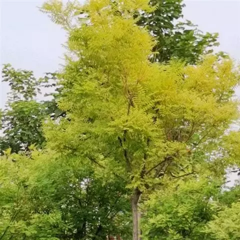 金枝槐树茎、枝一年生为淡绿黄色,入冬后渐转黄色,二年生的树茎、枝为金黄色,树皮光滑;叶互生,6~16片组成羽状复叶,叶椭圆形,长2.5~5厘米,光滑,淡黄绿色。树干墙直,树形自然开张,树态苍劲挺拔,树繁叶茂;主侧根系发达。生长快,当年嫁接苗可长1.5~2米高,第二年2.5~3.5米;性耐寒,能抵抗-30℃的低温;抗干旱性强,耐瘠薄。