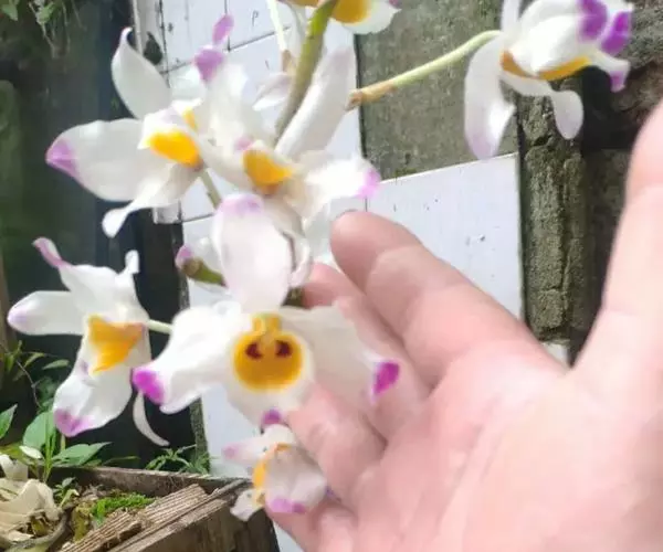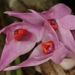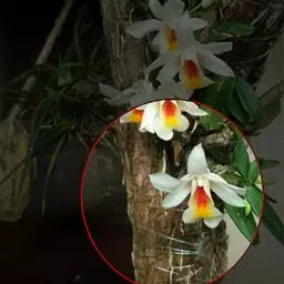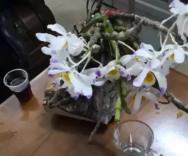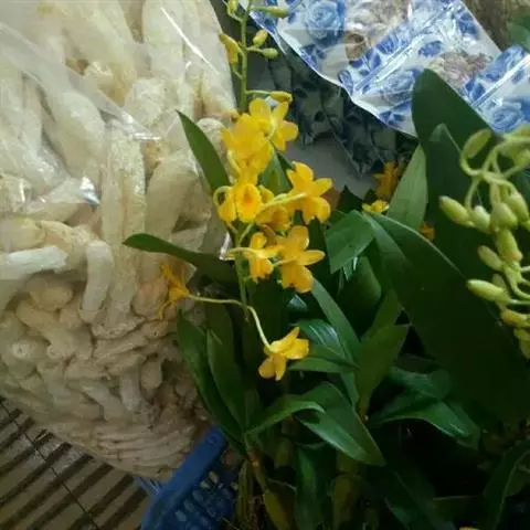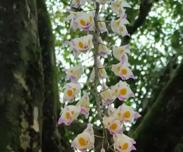 肿节石斛(学名:Dendrobium pendulum Roxb.):茎斜立或下垂,肉质状肥厚,圆柱形,不分枝,具多节,节肿大呈算盘珠子样。叶纸质,长圆形,先端急尖,基部具抱茎的鞘;叶鞘薄革质。总状花序通常出自落了叶的老茎上部,具1-3朵花;花大,白色,上部紫红色,开展,具香气,干后蜡质状;花瓣阔长圆形,长3厘米,宽1.5厘米,先端钝,基部近楔形收狭,边缘具细齿,具6条脉和多数支脉;唇瓣白色,中部以下金黄色,上部紫红色,近圆形。花期3-4月。