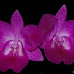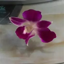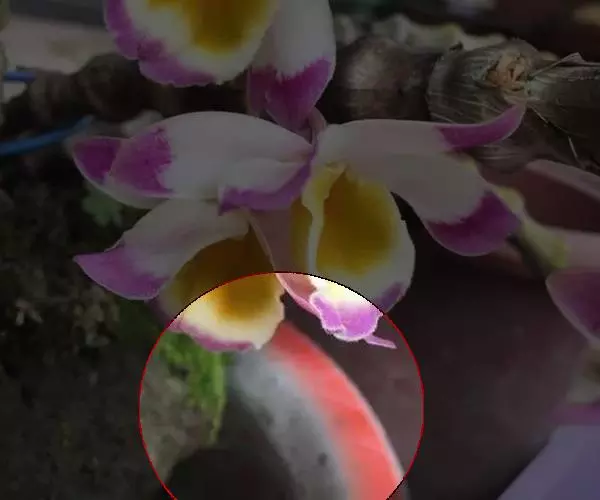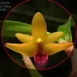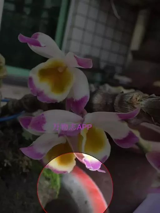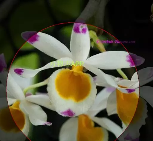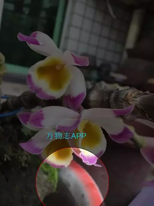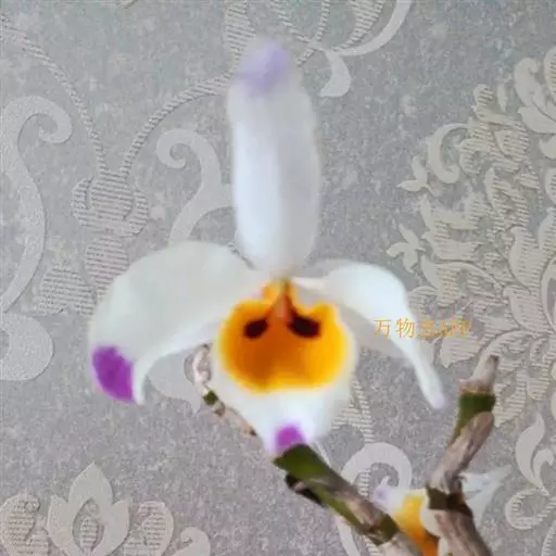 花瓣阔长圆形,长3厘米,宽1.5厘米,先端钝,基部近楔形收狭,边缘具细齿,具6条脉和多数支脉;唇瓣白色,中部以下金黄色,上部紫红色,近圆形,长约2.5厘米,中部以下两侧围抱蕊柱,基部具很短的爪,边缘具睫毛,两面被短绒毛;蕊柱长约4毫米,下部扩大,背面稍被细乳突;药帽近圆锥形,被细乳突状毛,前端稍收狭而近截形并具啮蚀状。花期3-4月。