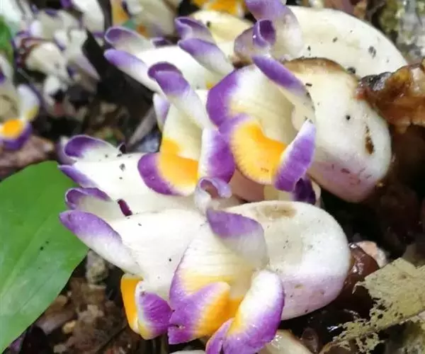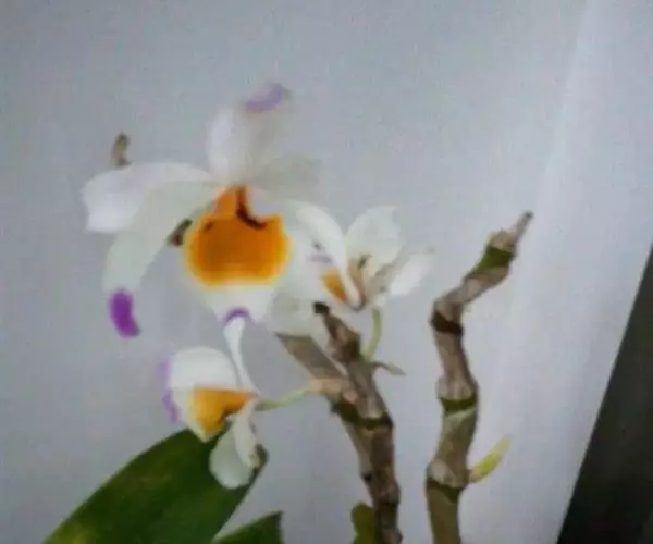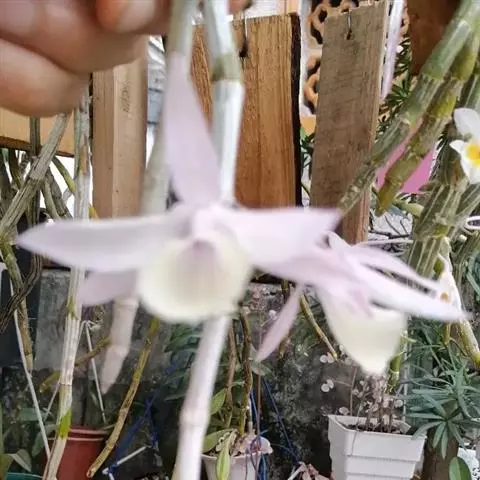 总状花序通常出自落了叶的老茎上部,具1-3朵花;花序柄较粗短,长2-5毫米,基部被1-2枚长约6毫米的筒状鞘;花苞片浅白色,纸质,宽卵形,长约8毫米,先端钝;花梗黄绿色,连同淡紫红色的子房长3-4厘米;花大,白色,上部紫红色,开展,具香气,干后蜡质状;中萼片长圆形,长约3厘米,宽1厘米,先端锐尖,具5条脉;侧萼片与中萼片等大,同形,先端锐尖,基部稍歪斜,具5条脉;萼囊紫红色,近圆锥形,长约5毫米。