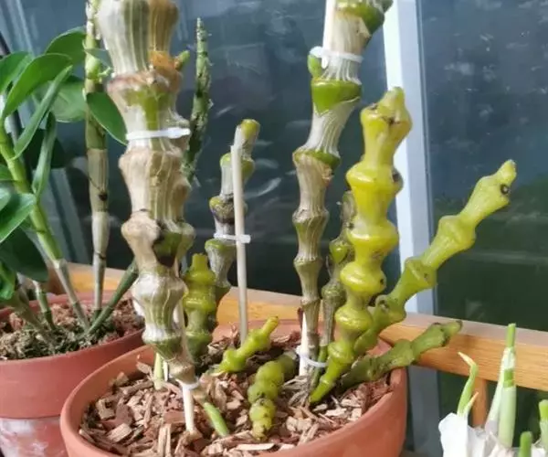 盆裁3年以上的植株或部分秋石斛茎的顶部或基部长有小植株时,可以进行切芽繁殖。选择具有3-4片叶,2-3条根,根长4-5厘米的小植株,从母株上切下,用草木灰或70%的代森锰锌处理伤口,将苗植入盆中即可。汪意要浅植。栽培2年后一般可开花成为商品花。
