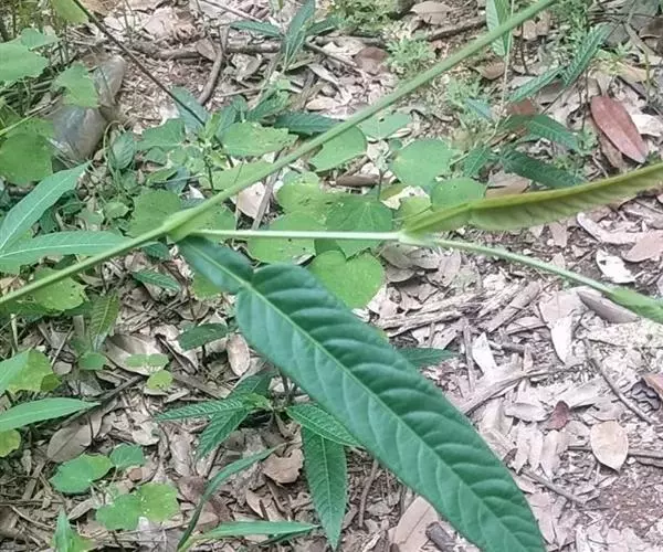 灌木或亚灌木,茎直立,高1-2米。幼枝三棱形,棱上被疏短硬毛,老时渐变无。叶仅具单小叶;托叶披针形,长1.3-2厘米,有条纹;叶柄长1-3厘米,两侧有宽翅,翅宽4-8毫米,与叶同质;小叶纸质,狭披针形至卵状披针形,长5.8-13厘米,宽1.1-3.5厘米,先端急尖,基部圆形或浅心形,上面无毛,下面中脉或侧脉疏被短柔毛,侧脉每边8-14条,不达叶缘,叶下面网脉明显。总状花序顶生和腋生,长15-30厘米,被贴伏丝状毛和小钩状毛;花2-3朵簇生于每节上;苞片钻形或狭三角形,长5-10毫米;花梗开花时长2-6毫米,结果时延长到5-8毫米,被小钩状毛和丝状毛;花萼宽钟形,长约3毫米,萼筒长1.5毫米,上部裂片三角形,先端微2裂或有时全缘,侧裂片披针形,下部裂片线形;花冠淡紫色或蓝紫色,长5-6毫米,伸出萼外,旗瓣近圆形,先端凹入,翼瓣倒卵形,基部具耳,龙骨瓣镰刀形,弯曲,瓣柄与瓣片近等长;雄蕊二体;子房被毛,有5-8胚珠,花柱无毛。荚果长2-5厘米,宽5毫米,全部密被黄色或白色糙伏毛,无网脉,腹缝线直,背缝线稍缢缩,有荚节5-8,荚节近方形;种子宽椭圆形或椭圆形,长2-3毫米,宽1.5-2.5毫米.花期6-10月,果期10-12月。