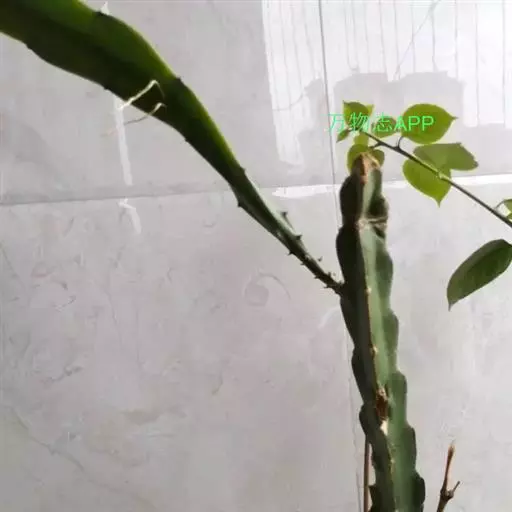 用利刀在霸王花的三棱柱适当高度横切一刀,然后将三个棱峰作30-40度切削,用消过毒的仙人刺刺入砧木中间维管束,将切平的接穗连接在刺的另一端,用刺将接穗和砧木连接起来,砧木和接穗尽量贴紧不留空隙,避免细菌感染不利愈合,然后在两旁各加一刺固定,再用细线绕基部捆紧。