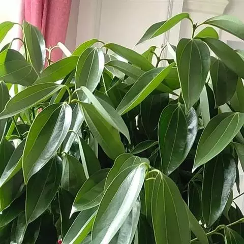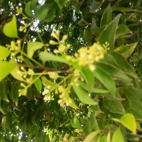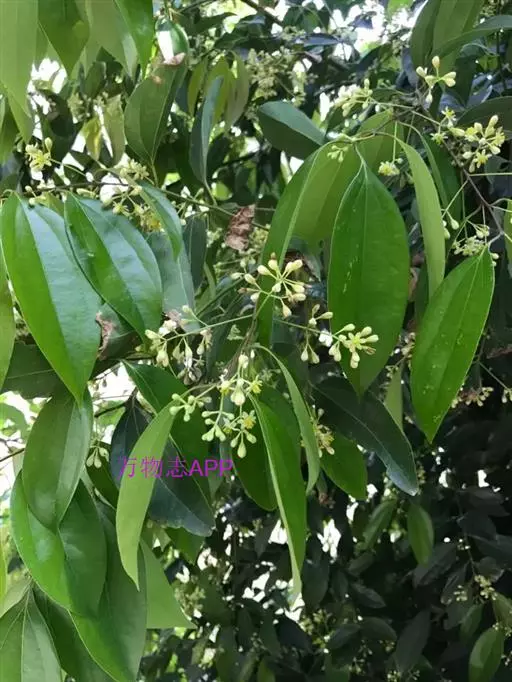 阴香(原变型)乔木,高达14米,胸径达30厘米;树皮光滑,灰褐色至黑褐色,内皮红色,味似肉桂。枝条纤细,绿色或褐绿色,具纵向细条纹,无毛。叶互生或近对生,稀对生,卵圆形、长圆形至披针形,长5.5-10.5厘米,宽2-5厘米,先端短渐尖,基部宽楔形,革质,上面绿色,光亮,下面粉绿色,晦暗,两面无毛,具离基三出脉,中脉及侧脉在上面明显,下面十分凸起,侧脉自叶基3-8毫米处生出,向叶端消失,横脉及细脉两面微隆起,多少呈网状;叶柄长0.5-1.2厘米,腹平背凸,近无毛。 圆锥花序腋生或近顶生,比叶短,长(2)3-6厘米,少花,疏散,密被灰白微柔毛,最末分枝为3花的聚伞花序。花绿白色,长约5毫米;花梗纤细,长4-6毫米,被灰白微柔毛。花被内外两面密被灰白微柔毛,花被筒短小,倒锥形,长\约2毫米,花被裂片长圆状卵圆形,先端锐尖。能育雄蕊9,花丝全长及花药背面被微柔毛,第一、二轮雄蕊长2.5毫米,花丝稍长于花药,无腺体,花药长圆形,4室,室内向,第三轮雄蕊长2.7毫米,花丝稍长于花药,中部有一对近无柄的圆形腺体,花药长圆形,4室,室外向。退化雄蕊3,位于最内轮,长三角形,长约1毫米,具柄,柄长约0.7毫米,被微柔毛。子房近球形,长约1.5毫米,略被微柔毛,花柱长2毫米,具棱角,略被微柔毛,柱头盘状。