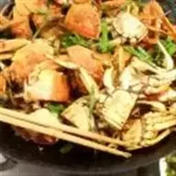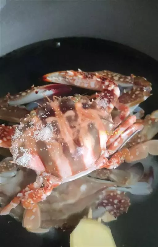 (3)加热油,加入蒜、姜、葱、辣椒酱爆香,再加入螃蟹5和适量的盐翻炒。