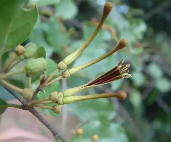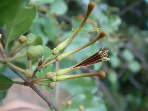总状花序,1-3个生于小枝已落叶腋部或叶腋,具花(2-)3-4(-5)朵,密集呈伞形,花序和花均密被褐色星状毛,总花梗和花序轴共长1-2(-3)毫米;花梗长2-3毫米;苞片卵状三角形,长约1毫米;花红色,花托椭圆状,长2-3毫米;副萼环状,具4齿;花冠花蕾时管状,长2.2-2.8厘米,稍弯,下半部膨胀,顶部椭圆状,裂片4枚,披针形,长6-9毫米,反折,开花后毛变稀疏;花丝长约2毫米,花约长3-4毫米,药室常具横隔;花柱线状,柱头圆锥状。