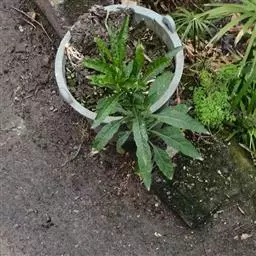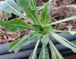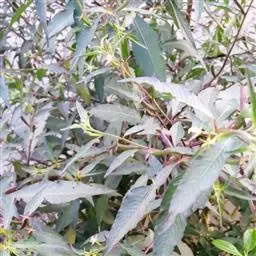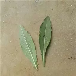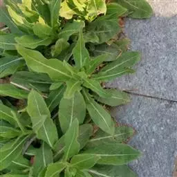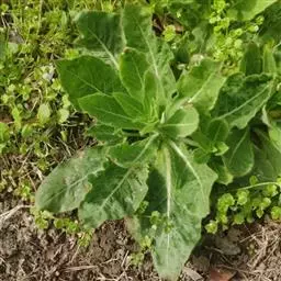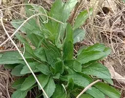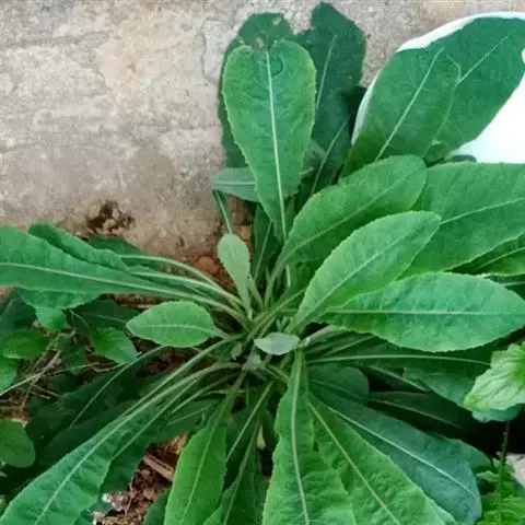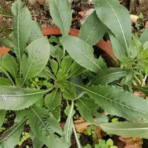 基生叶莲座状,倒披针形,长15-25厘米,宽4-5厘米,先端锐尖或稍钝,基部渐狭并下延为翅,边缘自下向上有远离的浅波状齿,侧脉5-8对,白色或红色,上部深绿色至亮绿色,两面被曲柔毛与长毛;叶柄长3-4厘米;茎生叶螺旋状互生,狭椭圆形至披针形,自下向上变小,长5-13厘米,宽2.5-3.5厘米,先端锐尖或稍钝,基部楔形,边缘疏生远离的齿突,侧脉8-2对,毛被同基生叶的;叶柄长2-15毫米,向上变短 。