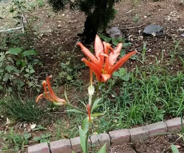 花1-5朵排成近伞形或总状花序;花梗长1.2-4.5厘米;花直立,星状开展,深红色,无斑点,有光泽;花被片有斑点,矩圆状披针形,长2.2-4厘米,宽4-7毫米,蜜腺两边具乳头状突起;雄蕊向中心靠拢;花丝长1.8-2厘米,无毛,花药长矩圆形,长约7毫米;子房圆柱形,长1-1.2厘米,宽2.5-3毫米;花柱稍短于子房,柱头稍膨大。蒴果矩圆形,长3-3.5厘米,宽约2-2.2厘米。花期6-7月,果期8-9月。
