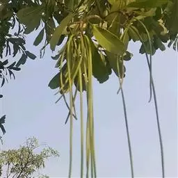 条圆柱形,嫩枝、叶具毛茸,茎枝多木化。单叶对生,叶片椭圆形,长可达12cm,先端渐尖,基部楔形,全缘,叶脉于下表面微突起。质较厚。有时可见花或果实。花淡黄棕色或类白色,高脚碟状。果实纺锤形,皱缩,长3.5-6cm,直径约3cm,橙黄色,顶端具短尖。气微,味微苦。
