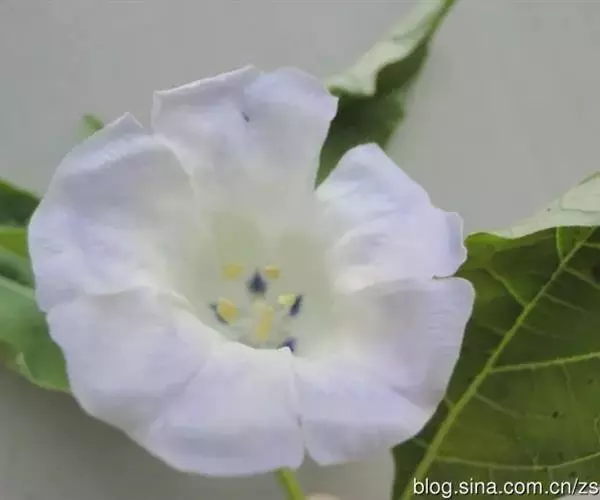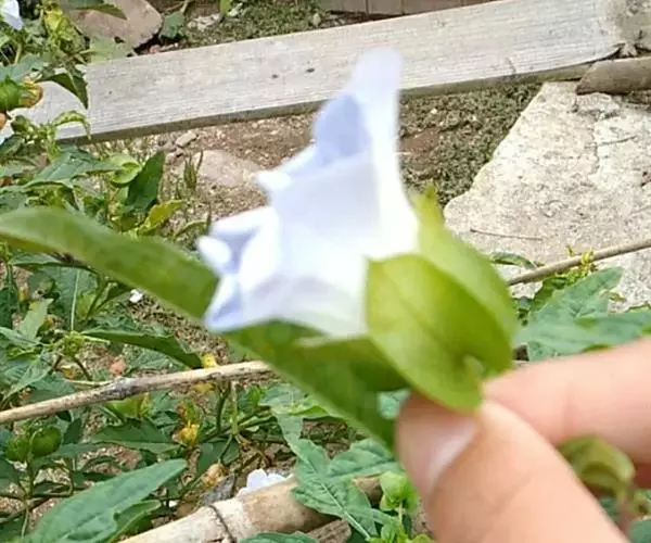 花单生于枝腋而与叶对生,通常具较叶柄长的花梗,俯垂;花萼5深裂,裂片顶端尖锐,基部心脏状箭形,有2尖锐的耳片,果时包围果实,直径2.5-4厘米;花冠钟状,浅蓝色,直径达4厘米,檐部有折襞,5浅裂。