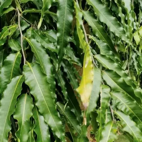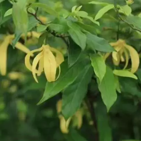 依兰 常绿大乔木,高达20多米,胸径达60厘米;树干通直,树皮灰色;小枝无毛,有小皮孔。叶大,膜质至薄纸质,卵状长圆形或长椭圆形,长10-23厘米,宽4-14厘米,顶端渐尖至急尖,基部圆形,叶面无毛,叶背仅在脉上被疏短柔毛;侧脉每边9-12条,上面扁平,下面凸起;叶柄长1-1.5厘米。