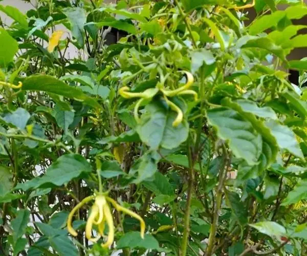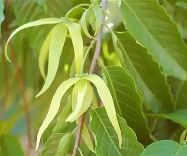 依兰(学名:Cananga odorata (Lamk.) Hook. f. et Thoms. )是番荔枝科,依兰属常绿大乔木,高可达20米,树干通直,树皮灰色;叶大,膜质至薄纸质,叶片卵状长圆形或长椭圆形,叶面无毛,叶背仅在脉上被疏短柔毛;上面扁平,下面凸起;花序单生于叶腋内或叶腋外,花大,黄绿色,芳香,花梗被短柔毛,有鳞片状苞片;萼片卵圆形,外反,绿色,花瓣线形或线状披针形,雄蕊线状倒披针形,果近圆球状或卵状,黑色。4-8月开花,12月至翌年3月结果。