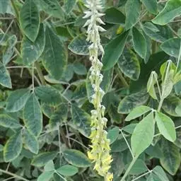 灌木 ,高约1米。茎、枝圆柱形,小枝“之”字形弯曲,密被开展、褐色短柔毛。托叶狭三角形,长6-7毫米,基部宽约2毫米,有条纹,被柔毛;叶柄长约3毫米,被褐色绒毛;小叶革质,顶生小叶披针形或长圆形,长13-20厘米,宽3.7-6厘米,先端渐狭而急尖,基部圆形或宽楔形,侧生小叶斜卵形,长3-4厘米,宽1.5-2厘米,先端急尖,上面疏被毛或近无毛,下面密被褐色软毛,侧脉每边8-15条,隆起,网脉明显;小托叶线形,长2毫米;小叶柄长1毫米,被褐色绒毛.伞形花序有花(5-)9-15朵,藏于叶状苞片内,由许多苞片排成顶生总状圆锥花序状,苞片斜卵形,先端微缺,长2.5-3.5厘米,宽2-2.7厘米;花梗长4-6毫米,被白毛;花萼长4-5毫米,被白色绒毛;花冠白色或淡黄色,旗瓣倒卵形,长8-9毫米,具瓣柄,冀瓣长7-8毫米,基部有耳,具瓣柄,龙骨瓣弧曲,长8-8.5毫米;雄蕊单体;雌蕊长9.5-10.5毫米,子房长3.5-4毫米,有胚珠7-8,花柱长5.5-6.5毫米,近基部处有柔毛。荚果长8-15毫米,宽3.5毫米,仅被缘毛,有荚节2-5,荚节近方形;种子宽椭圆形,长3毫米,宽2-2.3毫米。花期8-9月,果期10-11月。