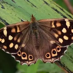 翅展50—60mm。雄前翅面基半部深蓝色,有黑绒光泽,中室内有2条不明显橙色棒带,2室眼纹不明显;后翅 面除后缘为褐色外,大部分呈宝蓝色光泽。雌深褐色,前翅中室内2橙色棒带和2室的眼纹明显;后翅大部为深褐色。眼状斑比雄蝶大而醒目。本种季节型明显。秋型前翅反面色深,后翅多为深灰褐色,斑纹模糊。夏型灰褐色,前翅黑色眼纹明显,基都有3条橙色横带;后翅眼纹不明显,红褐色波状斑驳分布其间。冬型颜色较深暗,所有斑纹皆不明显;前翅外缘6脉端明显向外突出。