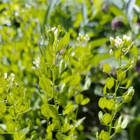 长角果圆筒状,长2.5-3厘米,宽约1毫米,无毛,稍内曲,与果梗不成1条直线,果瓣中脉明显;果梗长1-2厘米。种子每室1行,种子形小,多数,长圆形,长约1毫米,稍扁,淡红褐色,表面有细网纹。花期4-5月。